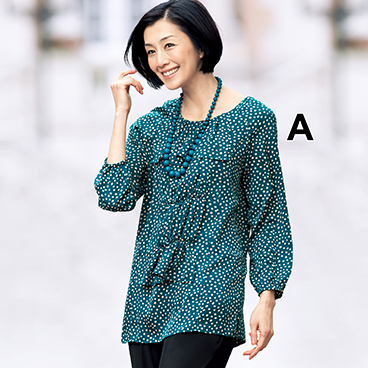 胸もとのピンタックが凜とした印象のきちんとスタイルに欠かせないシンプルシャツ。配色のボタン使いがほどよいアクセントです。