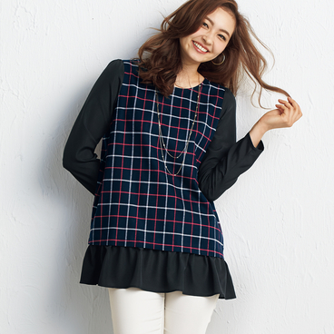 今期も人気のチェック柄デザイン。脇シャーリングで着丈アレンジも楽しめます。トールさんを考えたこだわりの長めの袖丈・ぴったり肩位置・ゆったり衿ぐり設計。