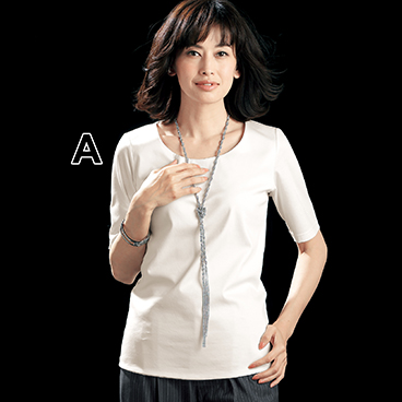 高級綿糸の新彊綿を使用。シルケット加工で光沢があり、なめらかな質感です。衿元は開きが美しいUネックで、手もとが軽やかな五分袖。