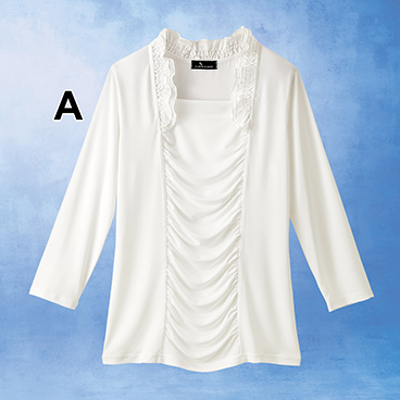 何層にも折り重なった波打つようなフロントデザインが印象的なプルオーバー。シフォンのエアリーな衿が品良く華やかさをプラス。