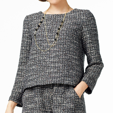高級感のあるツイード調素材で仕上げました。シンプルなデザインだからこそ上質感が際立ちます。広めの衿ぐりや九分袖なのでシャツとの相性もバツグンです。