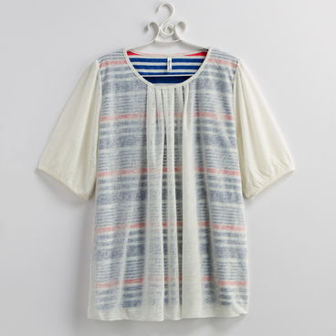 やわらかな透け感、前身頃のレースのあしらいが上品なプルオーバーです。かっちりした衿付なので甘くなりすぎないデザインも素敵ですよ。