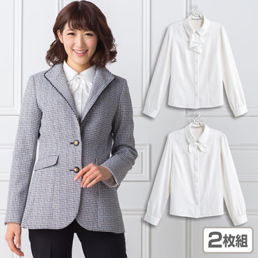 チェックとヘリンボーンの切替柄が華やか。旬のドロップショルダーで今っぽさもプラスしました。フロントのネックラインにあしらった程よい太さの2本のチェーンで、デコルテまわりをきれいに見せます。