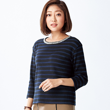 凹凸感があり表情のあるカットソー素材で、大人の女性にふさわしいシックな配色の洗練ボーダー柄。キラキラのビジューパーツをちりばめた衿もとが、濃色に映えて顔まわりを華やかに見せてくれます。