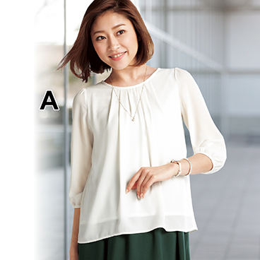 身頃は抗菌防臭のカットソーでまだまだ汗をかく季節にうれしい。袖はほんのり透けるシフォン素材でエレガント。