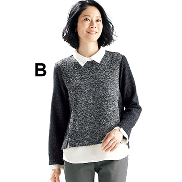 素材感にこだわったエレガントな重ね着風トップスです。個性ある上品な編み地のカットソー素材に、裾のシャツ部分はとろみ感のあるやわらかなジョーゼットを使用しています。