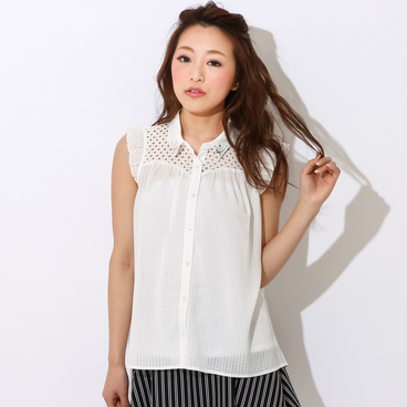 前身頃のレース使いとふんわりした七分袖で女らしさ満点のプルオーバー。付け衿は存在感のあるビジュー付きで、顔まわりを華やかに彩ります。