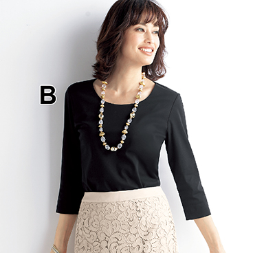高級綿糸の新彊綿を使用し、とても滑らか。更にシルケット加工で光沢のある美しい仕上り。衿元は開きが美しいUネックで、手もとスッキリの七分袖です。