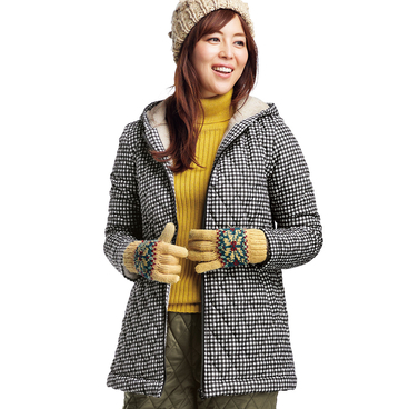 突然の小雨や雪にも対応できるあったかフード付き。軽くソフトな中わたなので裏ボア付きでもしなやかにフィットし、着ぶくれしません。