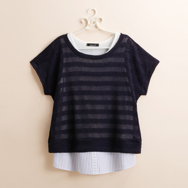 フェイクシャツ裾付のタンクトップとタオル風のやわらかい肌あたりが嬉しい透けボーダープルオーバーの2点セットです。