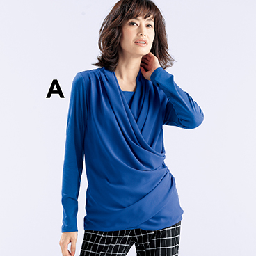 着心地のよいカットソーに、流れるようなジョーゼットのドレープの切替が優雅に映えます。シャープさも兼ね備えた女らしいトップス。