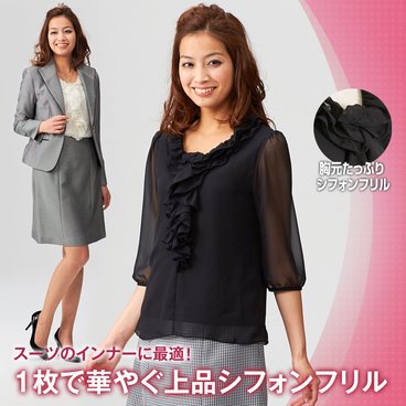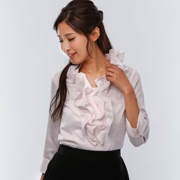一枚で女性らしく顔立ちを華やかに演出してくれる立ち衿フリルブラウス◎一枚着の時はドビー織でさりげなく表情感があり、普段のスーツにプラスするだけで華やかになり、お袖も七分袖でじゃまにならず、あらたまった…
