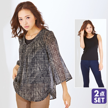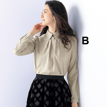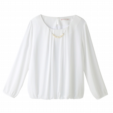 上品なジョーゼットシフォン素材のふんわりブラウス。コットンパールのネックレス付きできちんと感もあります。