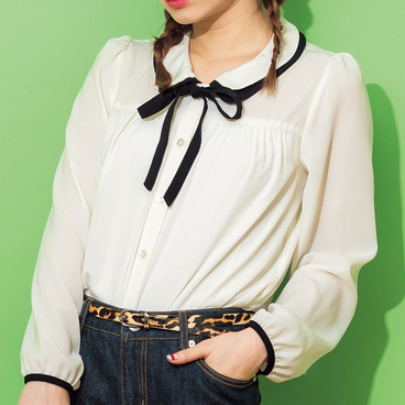 上品な透け感に裾の切替がポイント。リボン&レースが愛らしい鉄板ブラウスです。衿もとと袖口の配色使いが、甘さをシックに引き締めます。