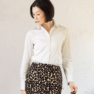 清潔感の漂うオフホワイトのシャツは活躍度が大!上品な比ヨクデザインで、一枚でスカートと合せたり、セーターのインに着て衿を見せたりとコーディネートにメリハリをプラスします。