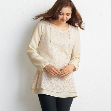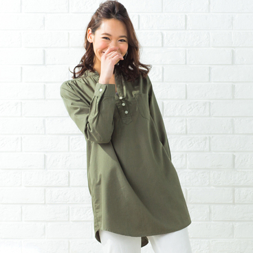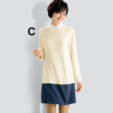 シャツとカットソーの重ね着に見えるトップス。衿は取り外し可能です。チュニック丈で賢く体型カバー♪落ち感のあるやわらかなレーヨン混カットソーでやさしい着心地です。