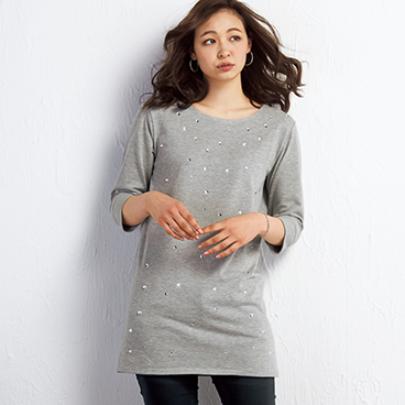 着心地のよい裏毛をクラス感のあるリッチなデザインに仕上げました。前身ごろ全体にダイヤモンドを散りばめたような、大胆なビジュー使いがゴージャスです。