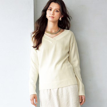 フェイスラインをすっきりと見せるVネック。太いリブと細いリブの大胆な切替はボディラインを目立たせない!
