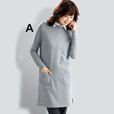 やさしい風合いで体型カバーにもお役立ちの長め丈チュニック。両脇にスリットが入っているので、動きやすいのもうれしいポイントです。
