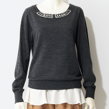 着心地のいい裏毛と軽やかなシフォンの、異素材切替デザインで仕上げました。裾から旬のプリーツがのぞくレイヤード風デザインが新鮮です。