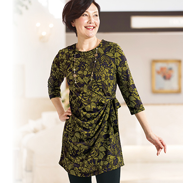 花モチーフの大胆柄プリントで、エレガントな雰囲気漂うチュニック。ウエスト部分にドレープを寄せたシルエットで、メリハリのあるデザインです。