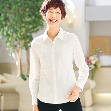 衿に付いたビジューの輝きがアクセント。顔まわりを華やかに彩ります。きちんと感のあるシャツに女性らしさをプラス。