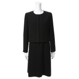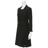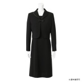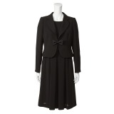 サテンリボンブローチ付きのノーカラージャケットと、五分袖ワンピースのアンサンブルです。ブラックフォーマルラインにて製造しているため、高品質で着用しやすいアイテムです。
