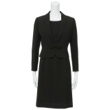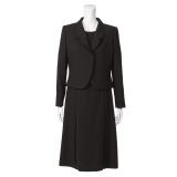 サテンリボンブローチ付きのノーカラージャケットと、五分袖ワンピースのアンサンブルです。ブラックフォーマルラインにて製造しているため、高品質で着用しやすいアイテムです。