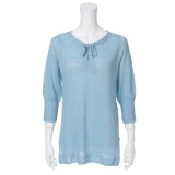 フレンチリネンを100%使用し、ハイゲージで繊細に編み上げたニット地でお作りした、リボン結びデザインがかわいい八分袖チュニックプルオーバーです。