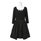 胸元のビジュウがアクセントになった、異素材で切り替えたデザインの七分袖ワンピースです。■身頃:上身頃はカットソー、スカート部分はタフタ素材を使用し、着やすいアイテムに仕上げました。