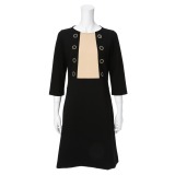 レーヨン混のポンチ素材を使用し、ボタンのトロンプルイユプリントにガラスをアクセントにあしらった、七分袖ワンピースです。