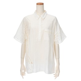 ■身頃:肌触りの良いコットンを100%使用。うっすらと柄が浮かび上がるようなシャドゥチェック風の生地とカットワークレースをアシンメトリーに切り替えた、ユニークでインパクトのある仕上がりです。