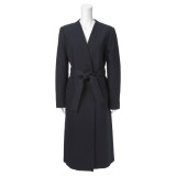共布ベルト付きのノーカラーダブルブレストロングコートです。■身頃:前中心には、ダブルブレストの隠しスナップを配しました。