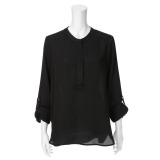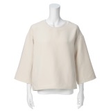 二重織のストレッチ素材を使用した、七分袖プルオーバーブラウスです。シンプルなアイテムを好む五明氏が、スカートにもパンツにも合わせやすく、さまざまな着こなしができるシンプルな一枚をデザインしました。