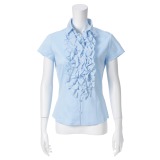 前立てにほどこしたフリルがかわいらしい半袖シャツブラウスです。■身頃:オーガンジーの1枚襟と前立てに挟み込んだフリルがアイキャッチな、ノーブルな雰囲気の一枚。