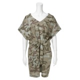 フレアフレンチリネン100%カモフラージュプリント半袖ワンピース