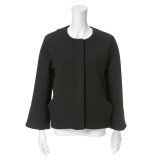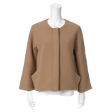 立体的なシルエットがかわいらしいノーカラーのジップアップジャケットです。ハリのあるダブルフェイス素材を使用し、丸みのある形に仕上げました。