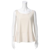 身頃にレーヨン混ポンチ素材を使用し、肩や裾などの部分をサテンで切り替えた、ベーシックで着回しのきくノースリーブプルオーバーです。