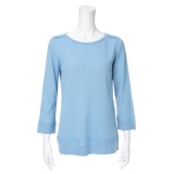 マリンテイストが爽やかな、柔らかい風合いの七分袖プルオーバーです。一見無地風のシンプルなデザインですが、肩や袖口や裾にマリンテイストのディテールを取り入れました。