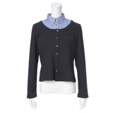 付け襟が付いた、綿混のカットソー素材を使用した、長袖のカーディガンです。付属の付け襟と一緒に着用すると、ダンガリーシャツにカーディガンをコーディネイトしたように見えるデザインです。