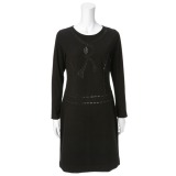 レーヨン混のポンチ素材を使用し、ボタンのトロンプルイユプリントにガラスをアクセントにあしらった、七分袖ワンピースです。