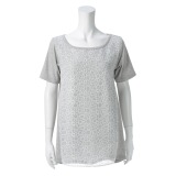 前身頃はシンプルなカットソーチュニックとシャツのフェイクレイヤード風のデザインで、後ろ身頃はフロントのシャツ素材を使用して切り替えた、半袖のチュニックプルオーバーです。