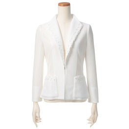 ■身頃:からみ生地を使用した、女性らしいデザインのジャケット。襟とポケット口にレースをほどこし、その上にラインストーンをあしらった、きらきらとしたゴージャスな仕上がりです。