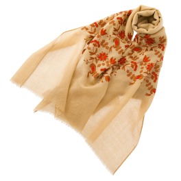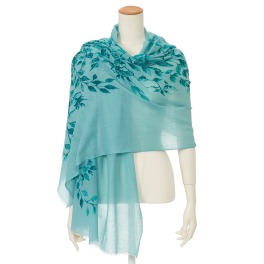 手触りの良いウール素材に立体感のある花刺しゅうをほどこしたストールです。ベース生地の色味に花刺しゅうのピンク色が映えるコントラストが魅力的な一枚です。
