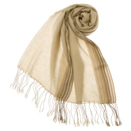 肌触りの良い柔らかな素材を使用したストールです。コーディネイトに合わせやすいベージュ色の生地の両端にボーダー柄をあしらいアクセントにしました。