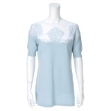 前後身頃上部にレースを使用し、前身頃のみビジュウをあしらった、かわいらしい雰囲気の半袖プルオーバーです。