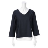 表地にサテンを裏使いした、プルオーバータイプの八分袖イージーブラウスです。■身頃:表地、裏地とも伸縮性のある生地を使用。