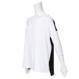 前身頃と後ろ身頃をバイカラーにした、ビッグシルエットの七分袖プルオーバーです。■身頃:ストレッチレーヨンの心地よい伸び感のあるベア天竺を使用。