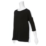前身頃と後ろ身頃をバイカラーにした、ビッグシルエットの七分袖プルオーバーです。■身頃:ストレッチレーヨンの心地よい伸び感のあるベア天竺を使用。
