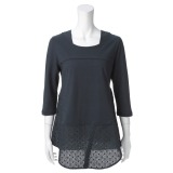 カットソー生地とカットワーク風のレース生地で切り替えた、爽やかかつ若々しいレイヤード風デザインの七分袖チュニックプルオーバーです。
